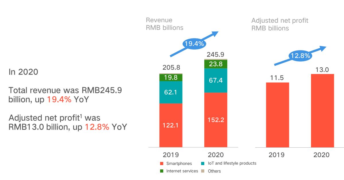 这个是小米2020年的营业额与净利,虽然2020年不是什么好的年份,但是公司的营业额增长了19.4%,净利润也增长了12.8%,而且她的三大核心业务,也都是保持着很不错的增长,当中更以手机业务成长最大,以24.6%的增长带领着公司前进。。